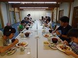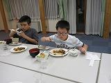 挨拶をして食事開始です。皆、おいしそうに食べていました。また、野菜の量も多かったのですが、苦手なものを食べようと挑戦する子もいました。夕食後は、つどい係が司会をして、夕べのつどいをしました。動物やスポーツなどのジェスチャークイズや青の煌めきダンスをして、楽しい時間を過ごしました。