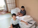 見学後はバスに乗り、つがる市地球村温泉藤山邸に到着しました。集会係が入所式を行い、各部屋へ入り入浴をしました。温泉に入りさっぱりしたようでした。夕食の前には、食事係が準備を行い、名札のセッティング、テーブル拭き、お水や豚汁をお盆にのせて運ぶ仕事をしました。