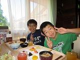 起床後は、着替えや洗顔をして、朝のつどいをしました。係の進行で健康観察、ラジオ体操をしました。朝食はバイキングで、好きなものを選んで食べました。