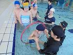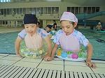 着替え、準備運動、シャワーを済ませて、1、2、3、4、6組は小さい方のプールでフラフープくぐりや宝探しをしました。
