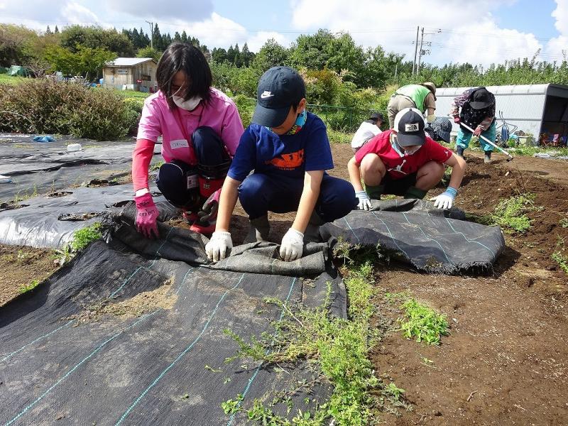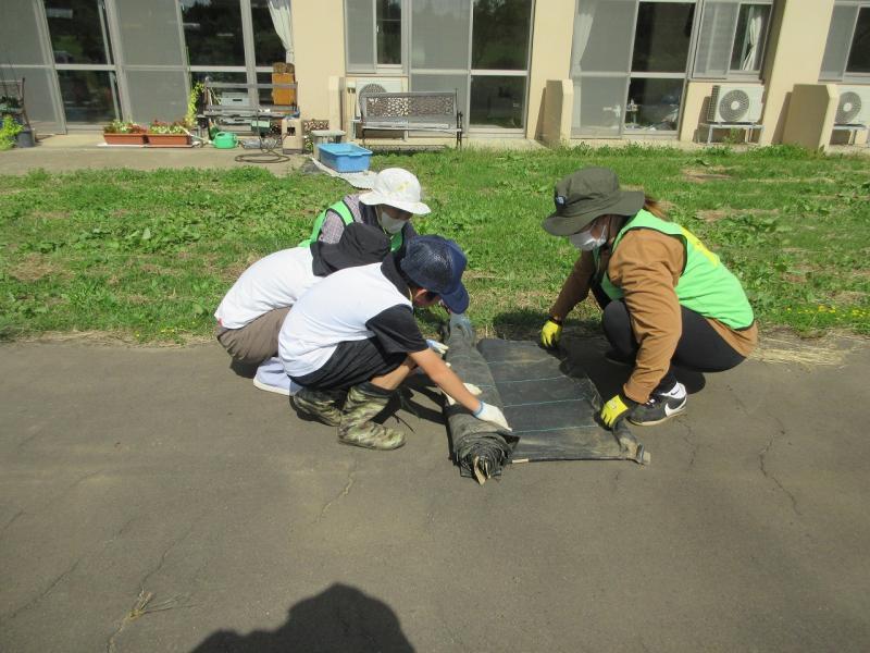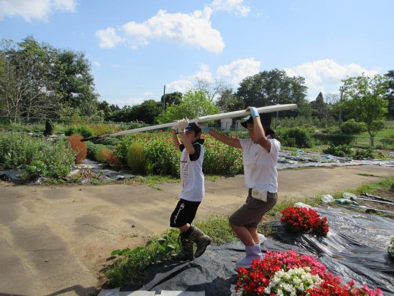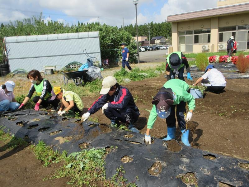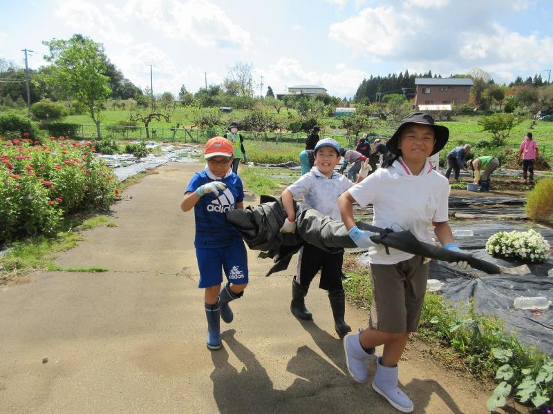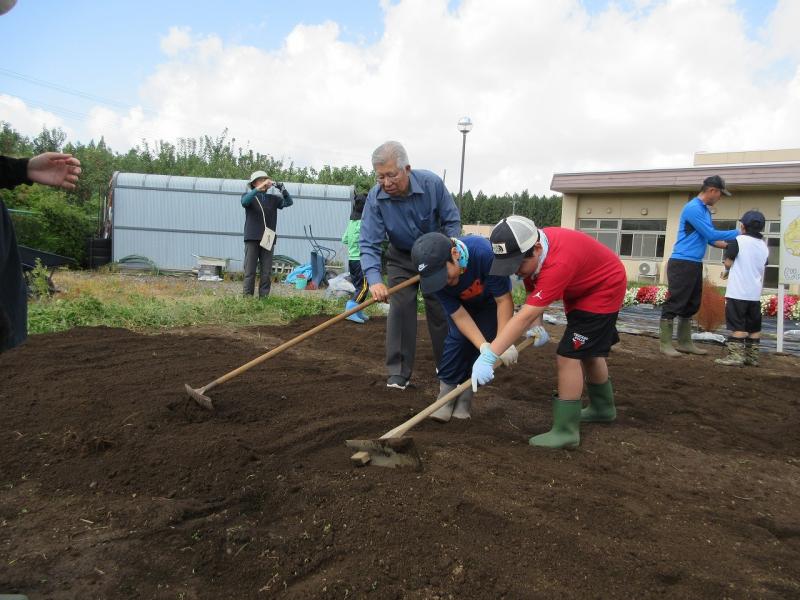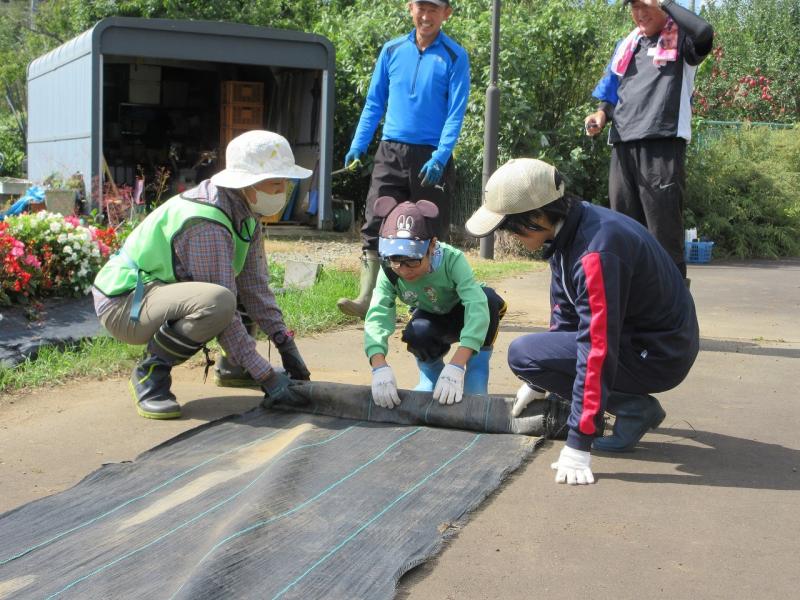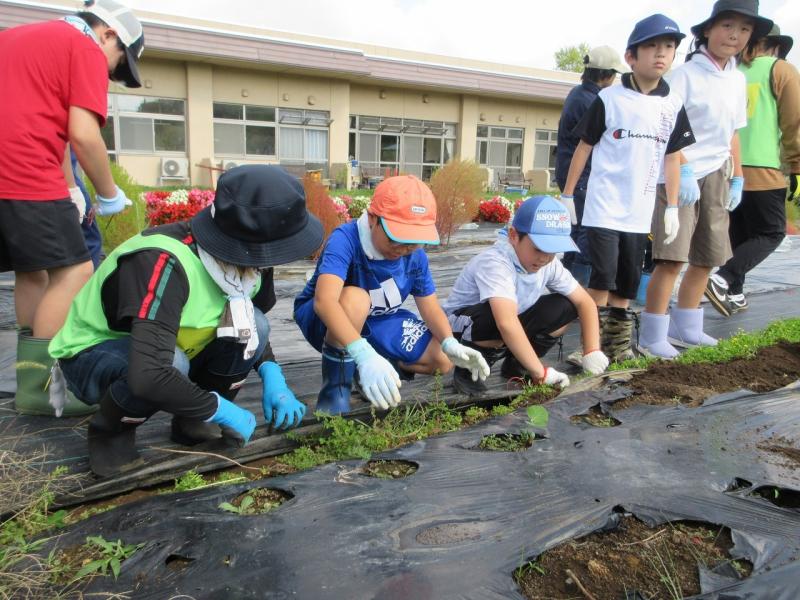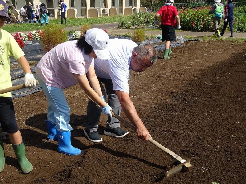 防草シートを巻き取ったり、鍬を使って土をならしたりするなど、難しい作業はひまわり応援隊やシルバークラブの皆さんが手伝ってくれました。また、鍬の使い方については教頭先生がコツを教えてくれました。子ども達は菜園に集まった大勢の大人から、「上手だね」「すごいね」とたくさん褒められ、やる気スイッチが全開!生き生きと活動する姿が見られました。
