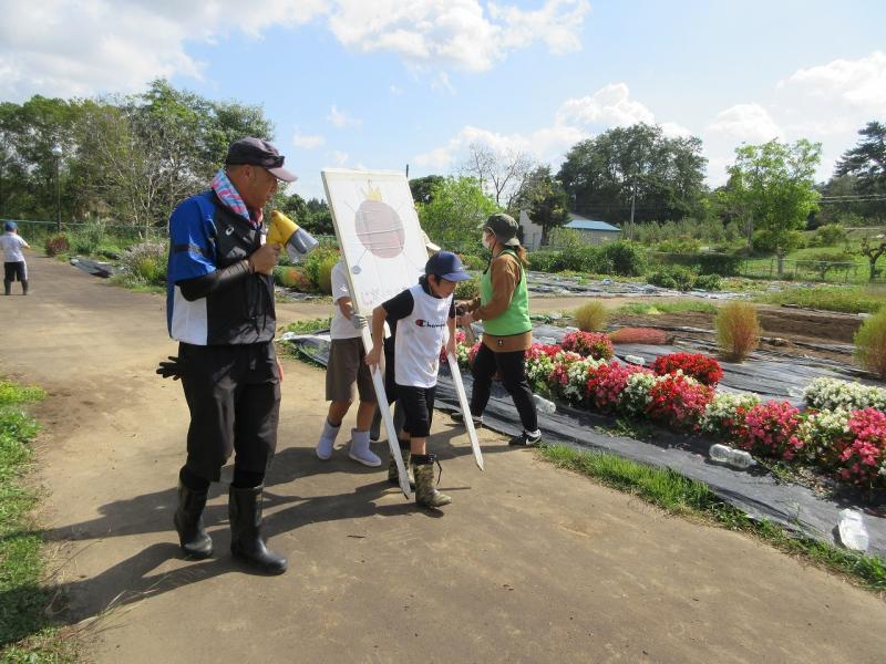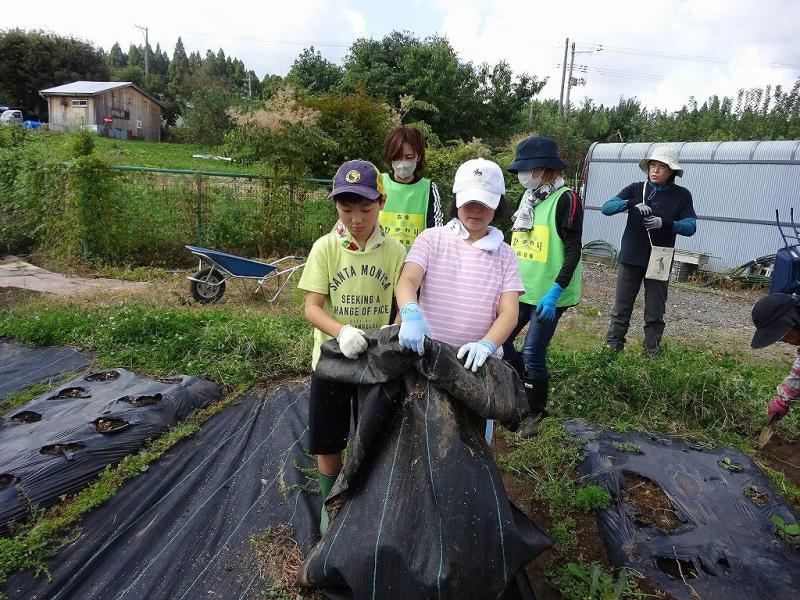 9月26日(金)、あーすとぴあの地域協働菜園において、今年度最後の活動を行いました。この日は菜園の片付けがメインで、防草シートやビニールマルチの片付け、枝豆や雑草の除去、看板撤去という流れで作業しました。広い畑の片付けはハードな作業になるかと思っていましたが、ひまわり応援隊やシルバークラブ、社会福祉協議会森田支所の皆さんが一緒だったため、大勢で会話をしながら楽しく作業することができました。