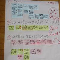 後半は4グループに分かれて「地域と子どもが共に輝く森田の学び~交流学習の実践を通して~」をテーマに熟議が行われました。KJ法(断片的な情報やアイデアを整理・統合するための手法)で、付箋には「合同清掃活動を通して、どんなことを感じたか。」「地域と子どもが共に輝く森田の学びとは、どんな姿か。」「次年度への提案 ※「できそうな一歩」を意識してまとめる」について書き出され、模造紙が付箋でいっぱいになりました。最後の各グループの発表は、感じたことやたくさんのアイデアであふれていました。活動を通して関わり合うことで地域愛や思いやりをもつことができ、それが自己肯定感や環境に対する意識の高まりにつながっていくことが各グループの共通点になっていたと感じました。