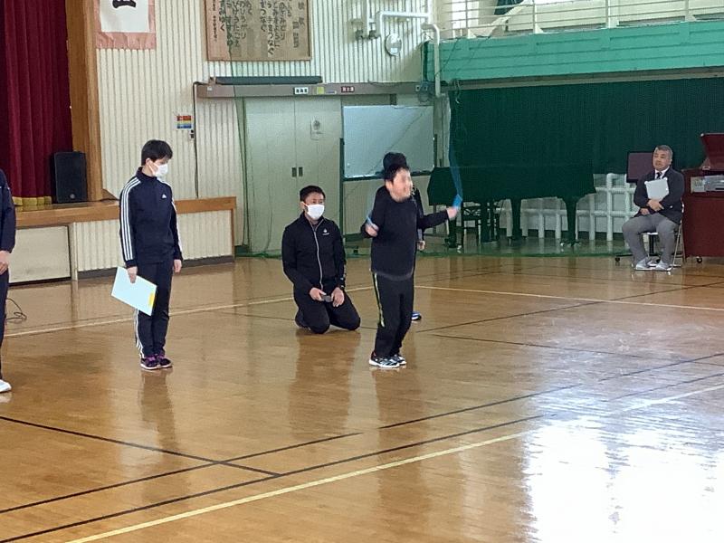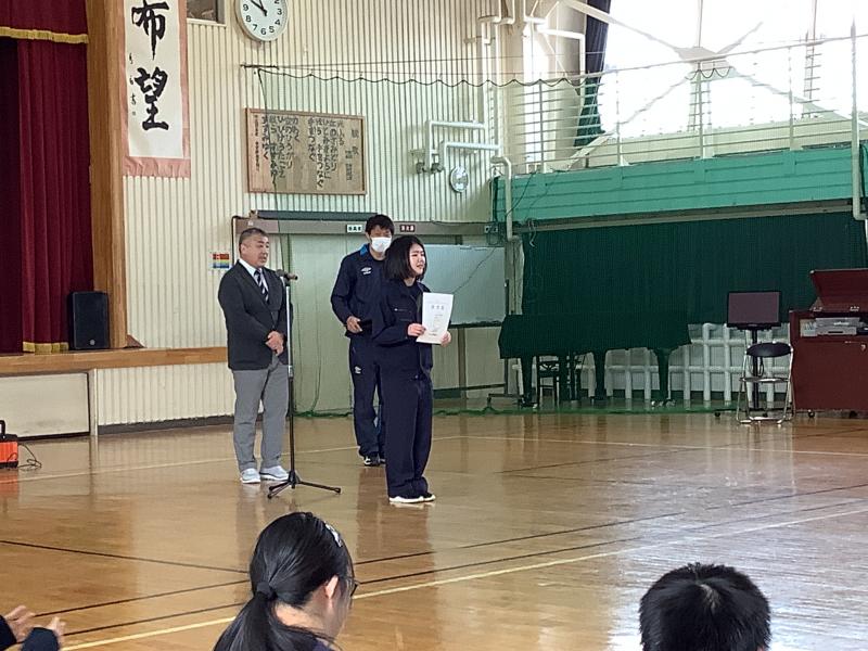 「令和7年度あすなろっ子元気アップチャレンジ」では、高等部4組の生徒全員による長縄8の字ジャンプ3分間持続記録が表彰されました。また、その様子がスライドで紹介されました。