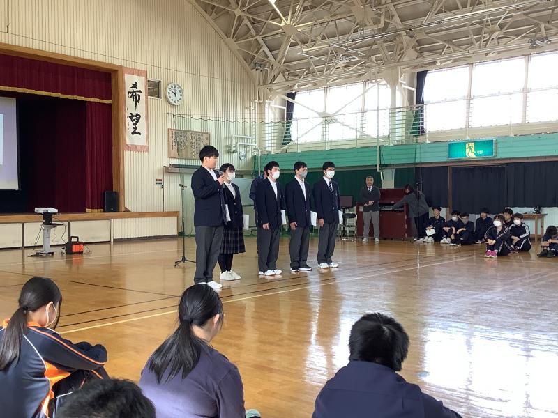 高等部生徒会新役員認証式では、新しく決まった次年度の生徒会役員が紹介され、新生徒会会長がみんなの前で抱負を述べました。