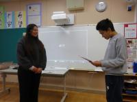当日は、事前学習で準備した自己紹介カードを使って、自分の名前や好きな物をマリア先生に伝えることができました。