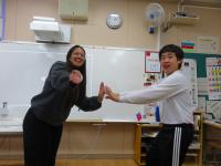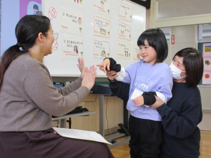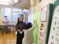 12月18日(木)、新しいALTのマリア先生と英語の学習をしました。3校時、1、2、6組の児童が、一人ずつ自己紹介をしたあと、「チェッチェッコリ」の手遊び歌に合わせて、頭や肩など身体の部位の英語を教えてもらいながらダンスを楽しみました。また、パラシュートを使った活動では、上下させる動きや1,2,3,4,5のカウントなどを英語で話し、音楽の授業を英語バージョンで楽しみました。みんな、優しいマリア先生に興味津々で、目をしっかりと見て挨拶していました。