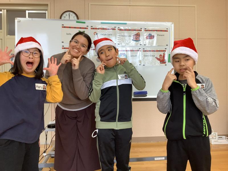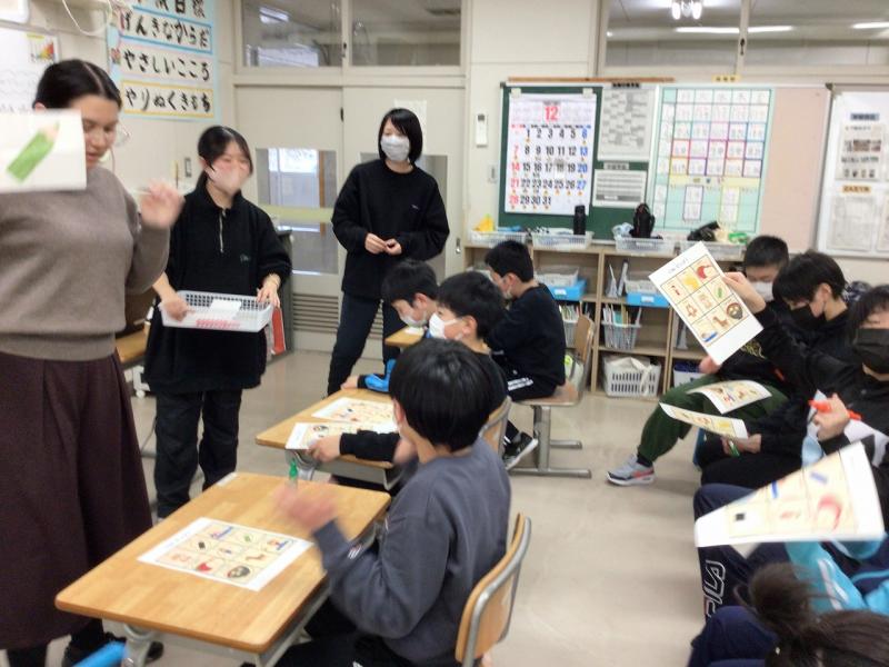 4校時は、3、4、5組の児童がクリスマスに関連した単語を使ったビンゴゲームを楽しみました。ビンゴになった児童は、マリア先生からサンタの帽子をかぶせてもらい、とても喜んでいました。「Christmas Tree」、「Snow Man」などマリア先生のあとに続いて話す英単語の模倣も、とても上手でした。回を重ねるにつれて堂々と自己紹介できるようになった頼もしい子供たちでした。