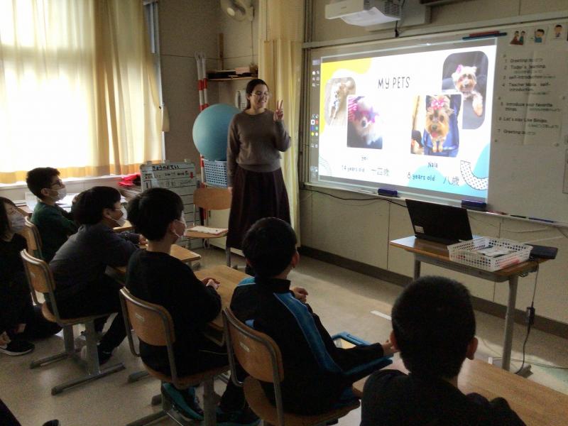5校時は、7,8組の児童が自分の好きなものやことを事前にタブレット端末で画像を選び、「I Like ~」でマリア先生に自己紹介をしました。キャラクター、食べ物、色、動物など、それぞれ自分で考えてきたことを堂々と発表していました。マリア先生から「Me too」と伝えられて「私も同じ」という表現も学び、その後子供たちからも「Me too」が何回も飛び交っていました。子供たちの吸収力はすごいですね。自己紹介のあとは英語ビンゴゲームで楽しみました。来年度、また楽しい英語を教えていただきましょうね。マリア先生、ありがとうございました。